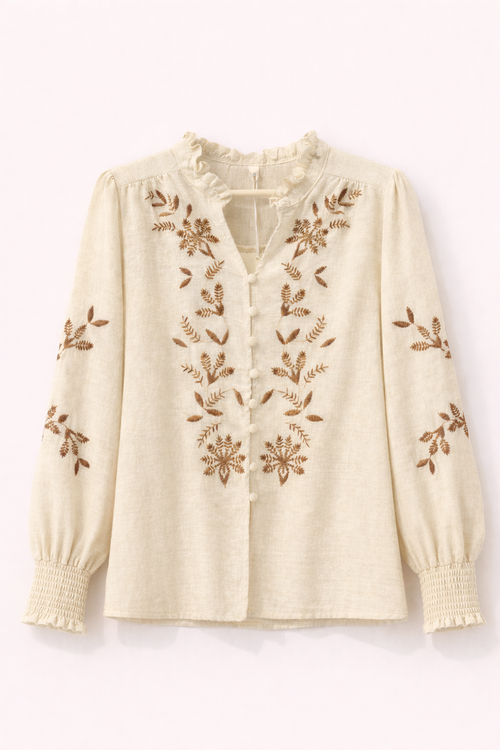 Beige Cotton Linen-Look Blouse with Brown Botanical Embroidery and Button Front